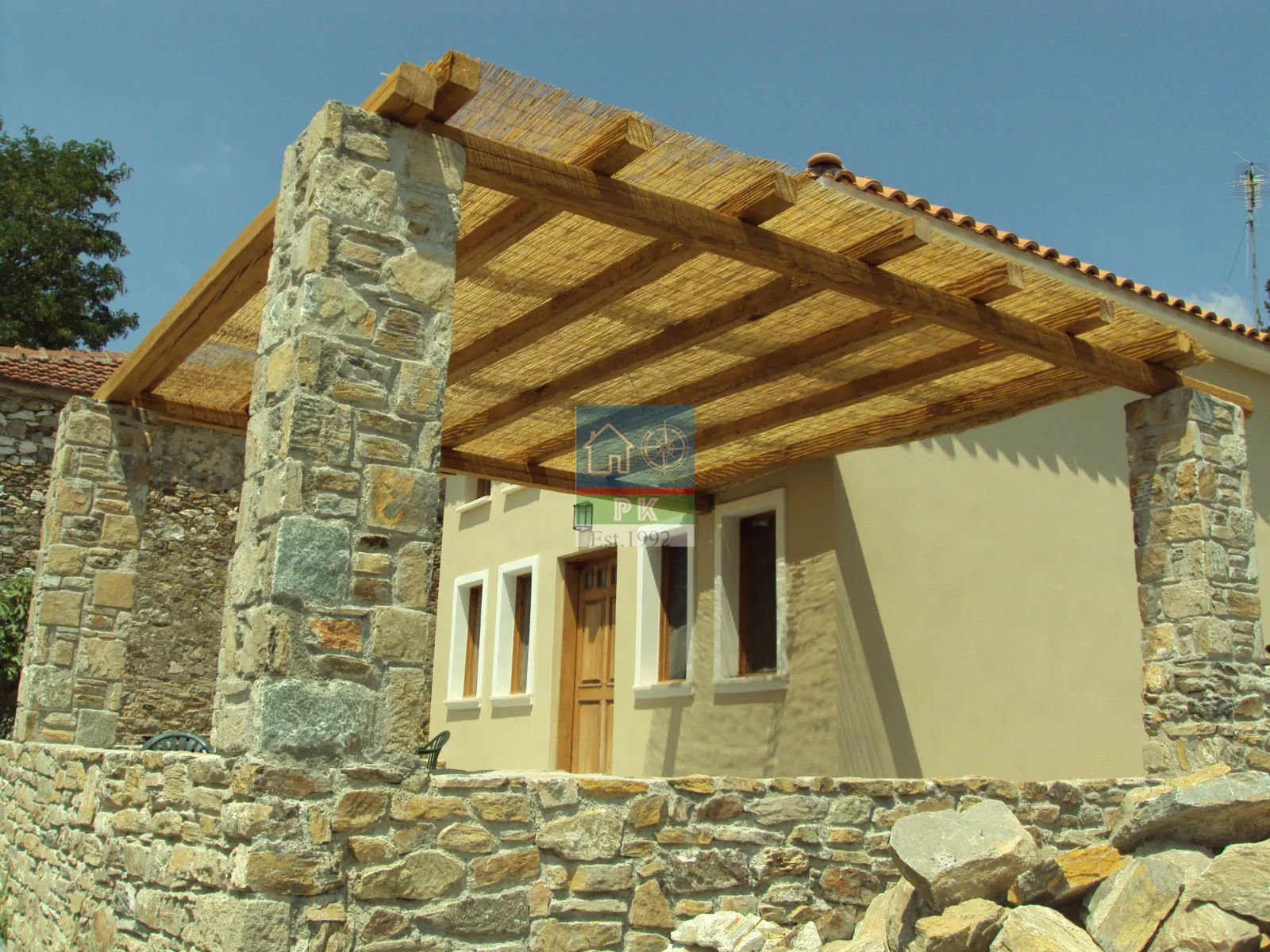 Έξω υπάρχει μια πέργκολα σε πέτρινες κολώνες.