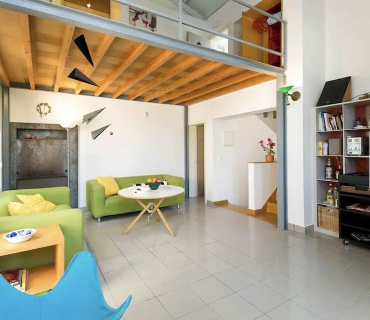 Σαλόνι ισογείου με τζάκι και πατάρι για χώρο γραφείου ή/και επιπλέον καναπέ – κρεβάτι.
